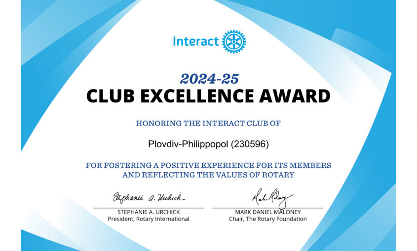 Интеракт клуб Пловдив – Филипопол е отличен с Interact Club Excellence Award 2024–2025 – най-високата международна награда за Интеракт клубове от Ротари Интернешънъл! Тази награда се дава на клубове, които създават положителна среда за своите членове, реализират реални инициативи и вдъхновяват с примера си. Ние постигнахме това само за година след възстановяването на клуба! Станахме
